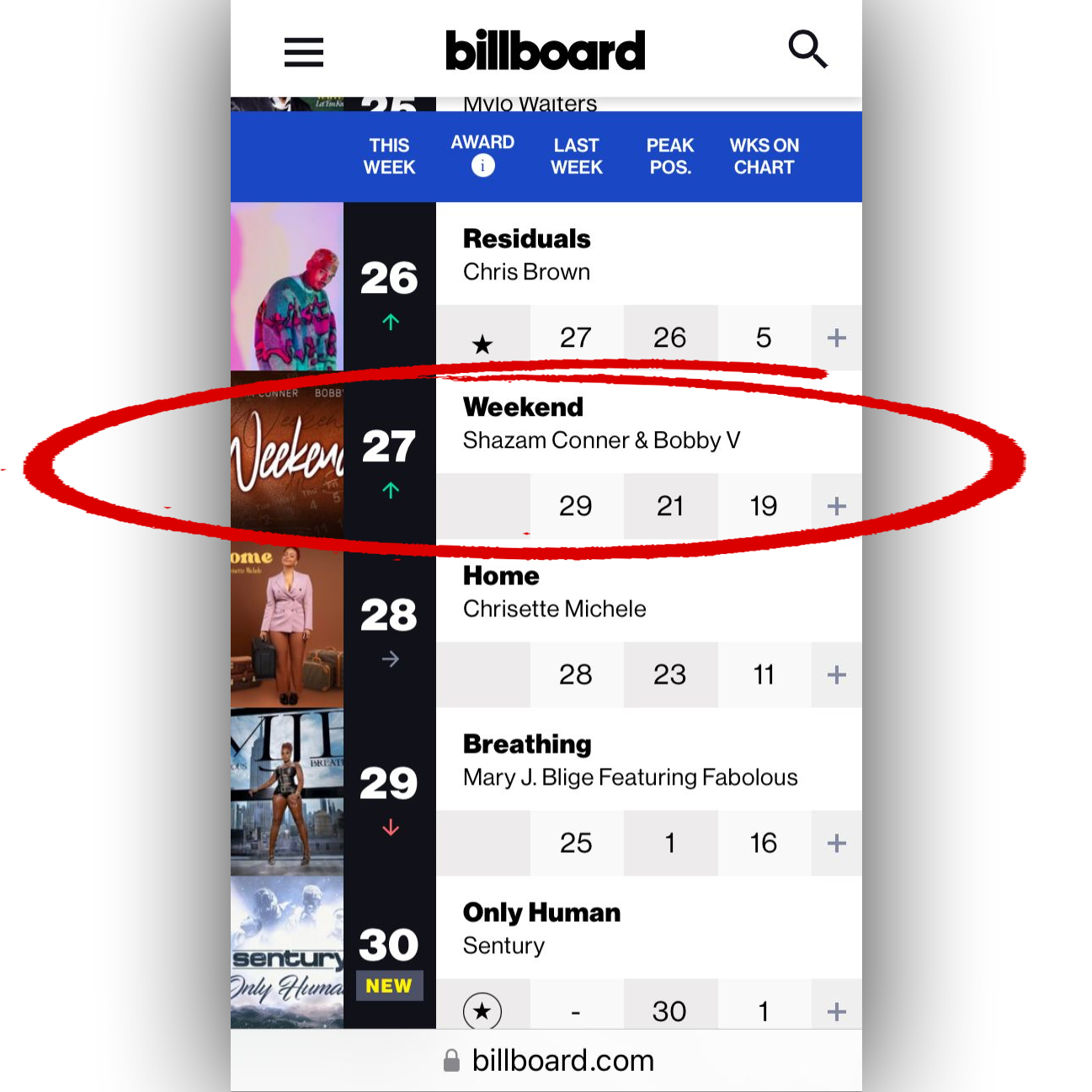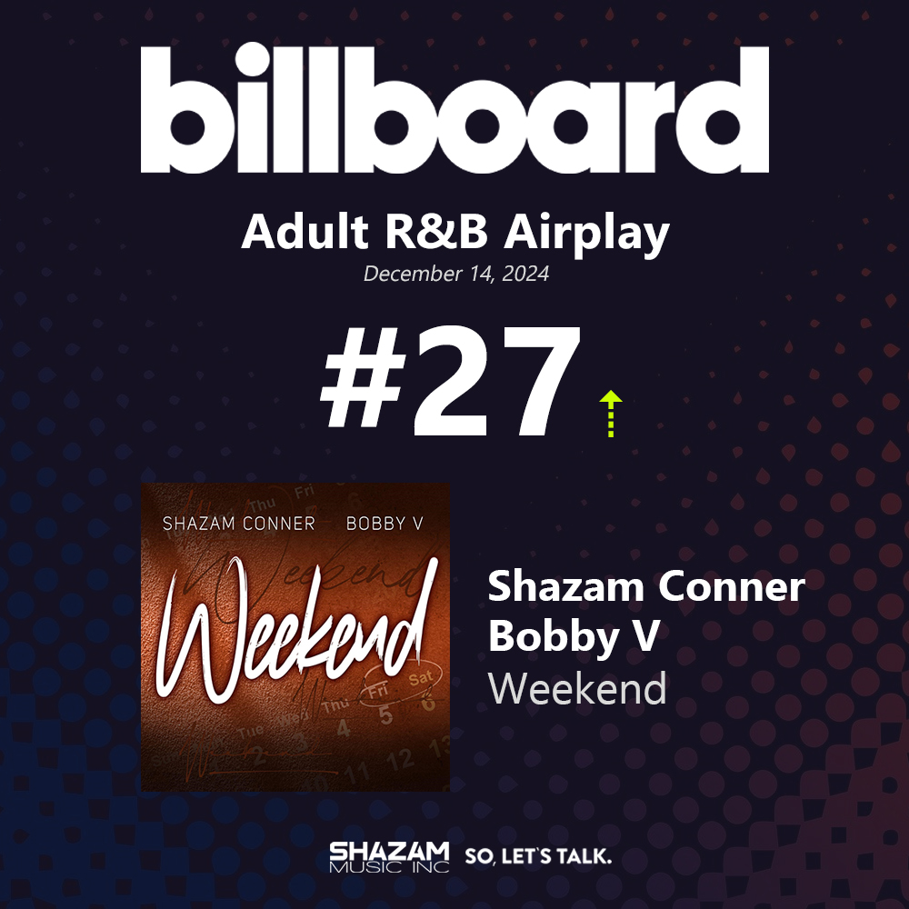 December 14, 2024 19 weeks on the official US Billboard charts for “Weekend” by Shazam Conner & Bobby V. Climbing back up to #27 this week on the Adult R&B Airplay Chart. https://www.billboard.com/charts/hot-adult-r-and-b-airplay/
